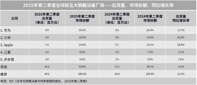 尽管全球智能穿戴市场竞争异常激烈,华为始终一骑绝尘。IDC最新数据显示,2025年第二季度,华为一举拿下全球与中国腕戴市场双料冠军。其中全球市场市占率高达20.2%,即全球每售出五台智能手表,就有一台来自华为。
